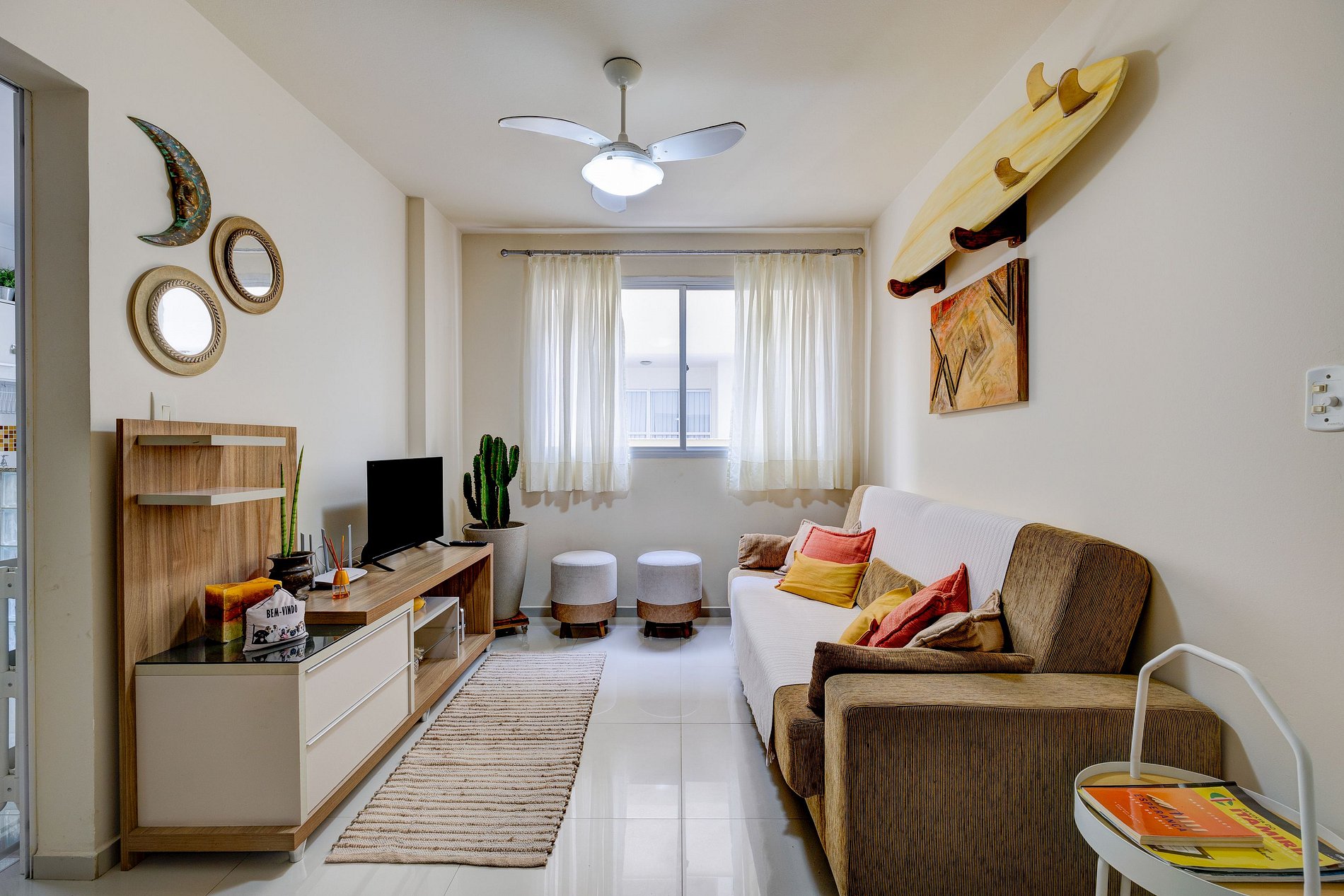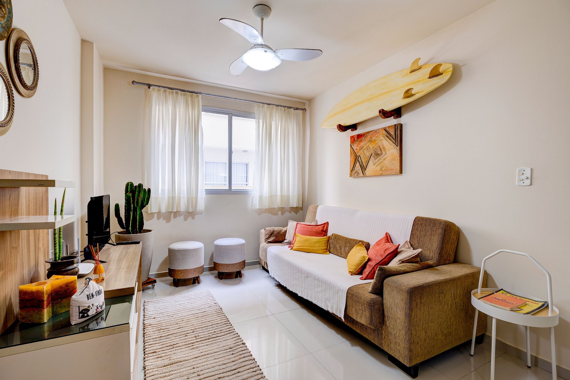 Apartamento localizado no sexto andar do prédio (sétimo pavimento) com ar-condicionado na suíte e ventilador de teto nos demais cômodos.
