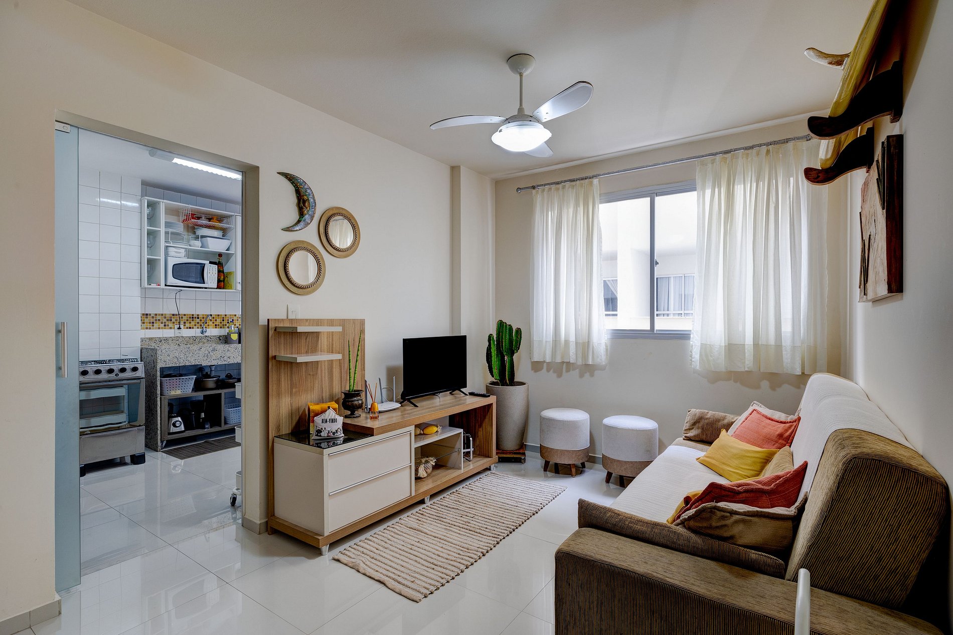 Apartamento localizado no sexto andar do prédio (sétimo pavimento) com ar-condicionado na suíte e ventilador de teto nos demais cômodos.